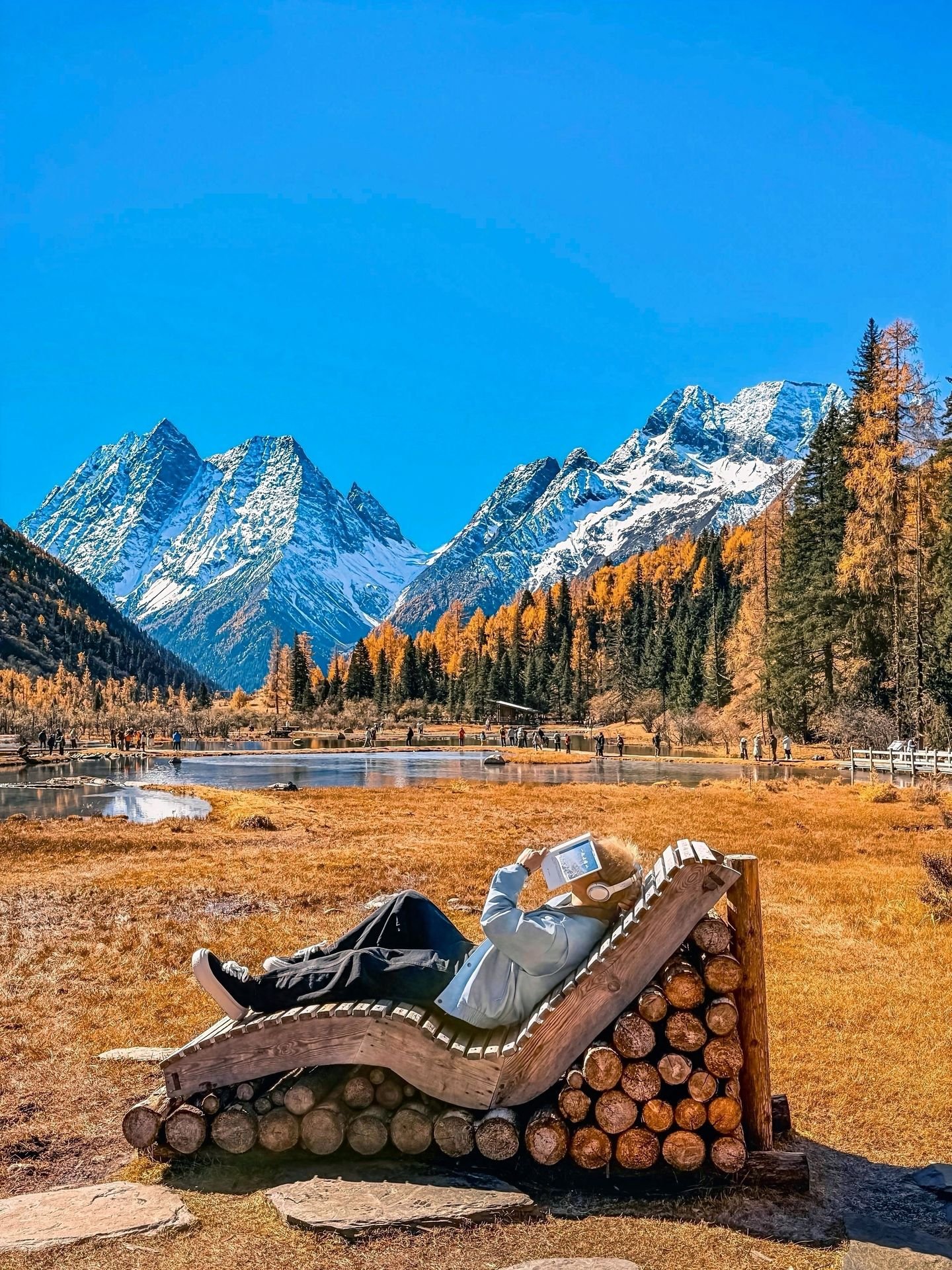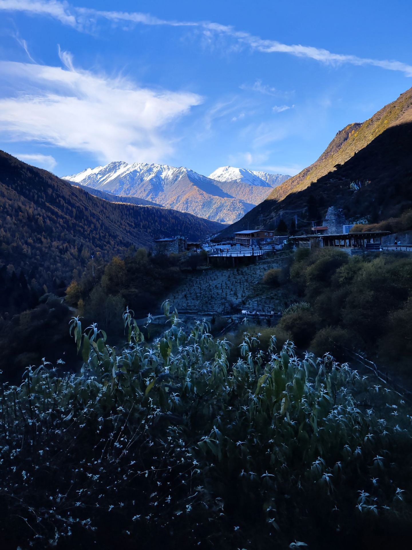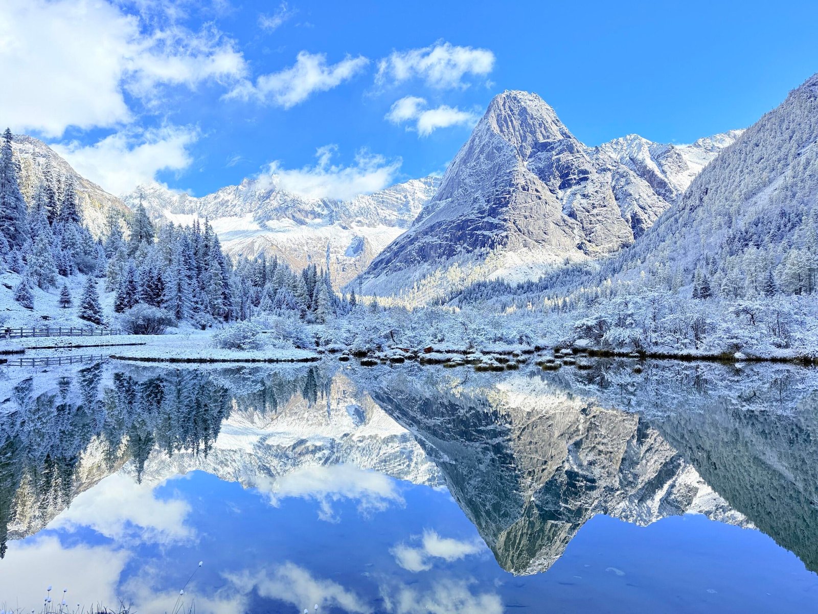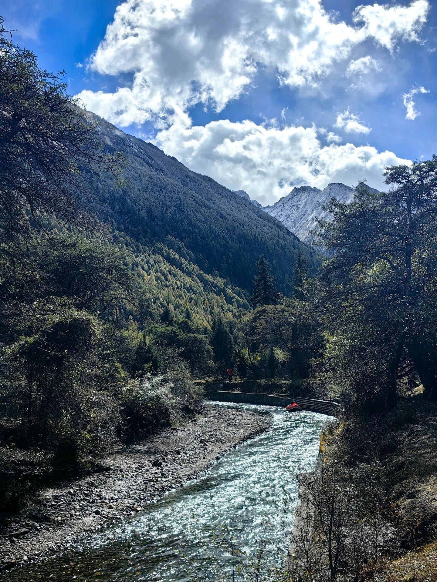 Rising proudly within Jiuzhaigou Shuangqiao Valley, Budala Peak towers above the verdant valley as a striking symbol of alpine grandeur. Its snow-capped summit glimmers under the sun, casting reflections on the streams and lakes below. Framed by lush forests, the peak is especially breathtaking in autumn, when golden and crimson foliage contrasts with the pristine white of the mountain, creating a scene of vivid splendor—like a living masterpiece painted by nature itself.